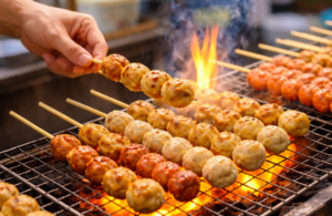 A curated selection of Thai street food favorites, featuring deep-fried fish balls, pork balls, assorted meatballs, and hot dogs served from local kiosks, served with a selection of refreshing beverages crafted to complement the celebration.